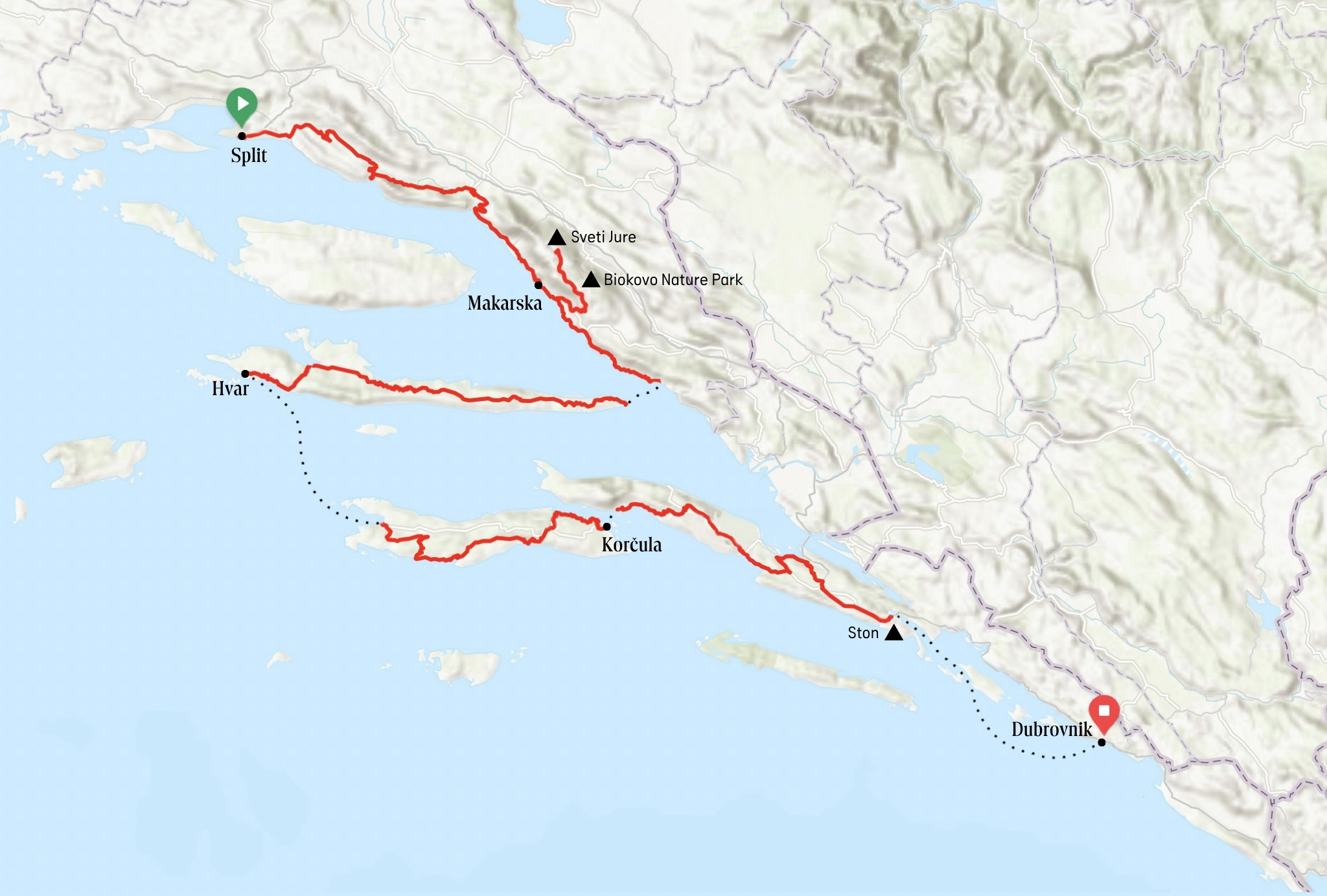 From Split, we descend down the coast to tackle one of the most impressive climbs in Eastern Europe. Then, we island-hop for a couple of days before riding all the way to the famed medieval jewel of Dubrovnik.